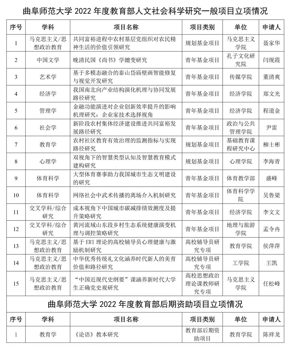 连续五年位列省属高校首位——曲阜师大获立15项2022年度教育部人文社科项目