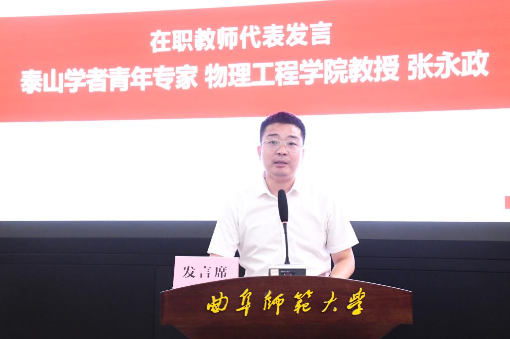 泰山学者青年专家、物理工程学院张永政教授与各位青年教师分享了在曲园工作、成长的经历与经验。他表示,相信新进教师在学校提供的浓厚学术氛围、科研条件和优良的人文环境影响下,能够迅速地融入曲园大家庭,在奋斗中实现自身价值,成为优秀的曲园建设者、教育工作者。