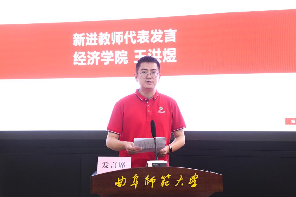 新进教师代表,经济学院教师王洪煜博士在发言中表达了以优秀前辈为榜样,树立崇高理想信念,牢记立德树人根本任务,不断提高自身的教学和科研能力,用奋斗和追求为学校、社会发展添砖加瓦、贡献力量的决心。