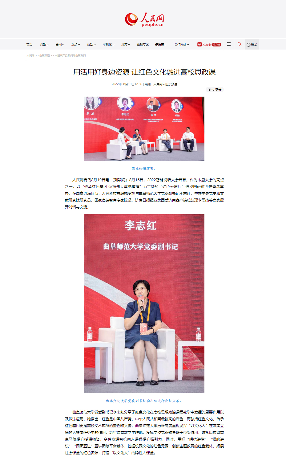 8月16日,由中央网信办、人民日报社、山东省人民政府指导,青岛市人民政府、山东省委网信办、人民网主办的2022智能视听大会开幕。作为本届大会的亮点之一,以“传承红色基因 弘扬伟大建党精神”为主题的“红色云展厅”进校园研讨会在青岛举办,人民网以《筑牢红色教育阵地 为现代化强省建设贡献曲师力量》《用活用好身边资源 让红色文化融进高校思政课》为题报道了乐鱼(中国)厚植传统底蕴、传承红色基因、推进立德树人的红色教育开展情况。