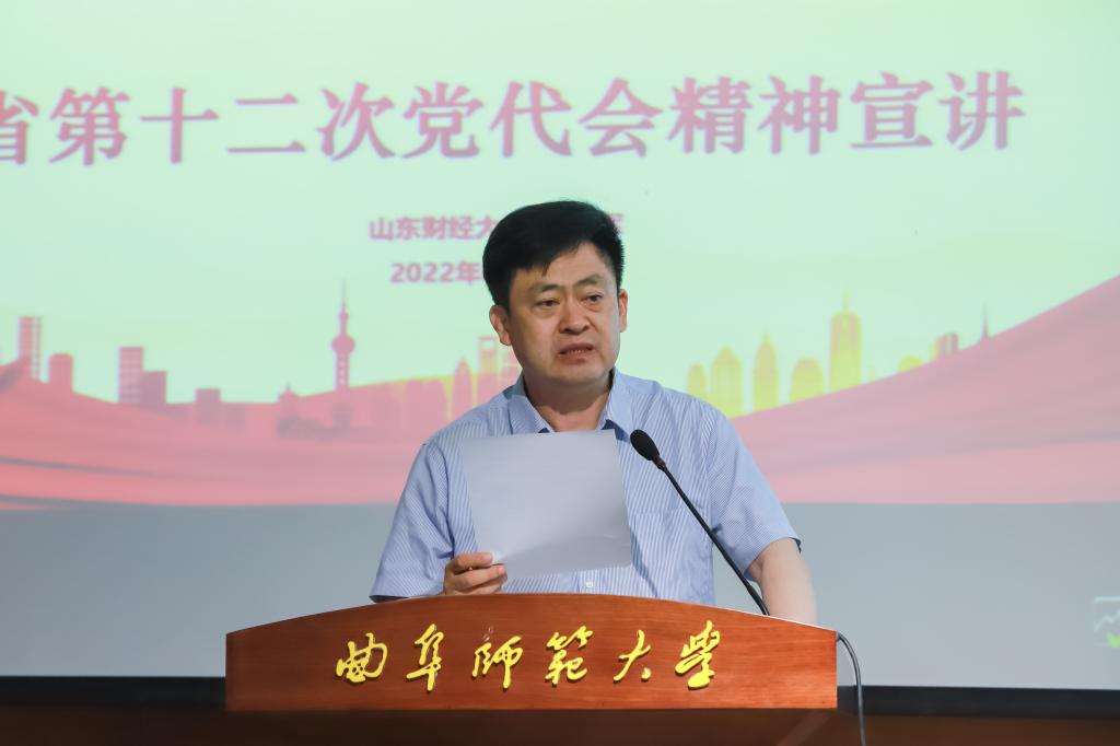 曲阜师大新闻中心讯(记者:孙琪 摄影:李文振 刘萌) 6月28日,学习贯彻省第十二次党代会精神省委宣讲团走进乐鱼(中国),省委宣讲团成员、山东财经大学党委书记王邵军作宣讲报告。乐鱼(中国)党委理论学习中心组全体成员,处级以上干部,全体辅导员和学生代表参加报告会,会议由乐鱼(中国)党委书记戚万学主持。