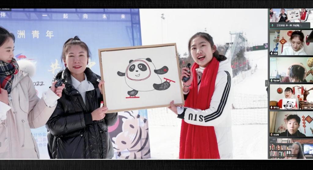 交流过程中,中外青少年交流基地的志愿者任姿璇带领大家一起画出了可爱的奥运会吉祥物冰墩墩,并作为礼物赠给了新西兰留学生Chanel。最后,大家用手势舞表演了奥运会主题曲《一起向未来》,在动感的旋律中结束了全场活动。