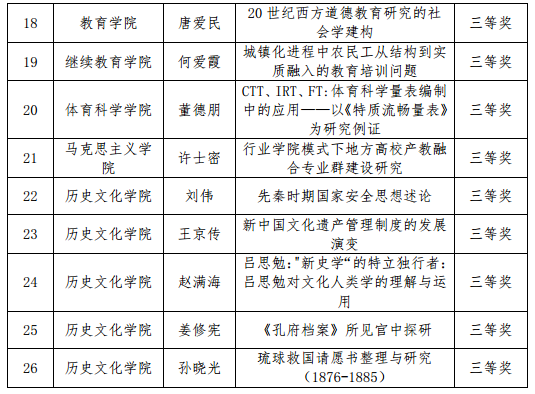 本届获奖成果涵盖9个学科:历史学8项,教育学6项,经济学4项,管理学、文化学 各2项,政治学、哲学社会学、文学语言学、社科普及类成果各1项;分布在15个单位:历史文化学院8项,经济学院3项,党委办公室(校长办公室)、政治与公共管理学院各2项,马克思主义学院、教育学院、地理与旅游学院、翻译学院、国际教育学院、管理学院、继续教育学院、美术学院、体育科学学院、孔子文化研究院、研究生处各1项。