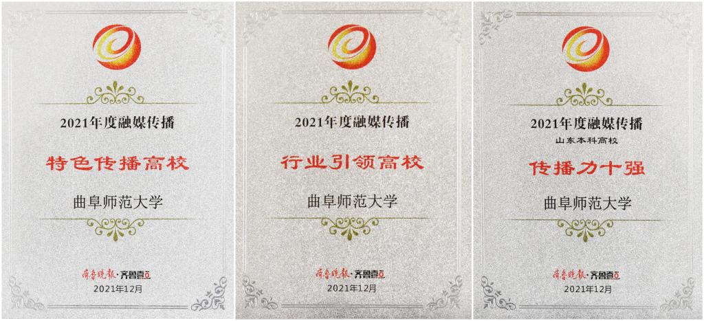 学校被中国教育报刊社授予“2021年度高校教育新闻宣传先进单位”荣誉称号;在山东省互联网传媒集团主办的山东教育品牌建设与传播管理研讨会上,乐鱼(中国)荣获“2021年度山东最佳社会声誉高校”、“2021年度山东最具影响力教育政务融媒体”两个奖项;在齐鲁晚报·齐鲁壹点主办的2021高校融媒传播论坛颁奖典礼上,学校入选“2021年度融媒传播特色传播学校”、“2021年度融媒传播行为引领高校”、“2021年度融媒传播山东本科高校传播力十强”。山东广播电视台融媒体资讯中心授予2021年度融媒体影响力奖。