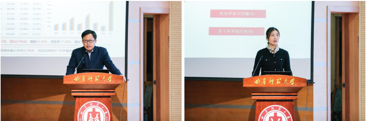 会上,科学技术处处长杨月伟、社会科学处处长朱莉雅介绍了2021年国家“两金”项目的整体立项和分布情况,回顾了2021年度取得的成绩与突破,对学校近年来国家“两金”申报过程中存在的问题进行了深入剖析,并就2022年度申报工作提出了建议。在经验交流环节,统计学院院长赵胜利、历史文化学院副院长王京传围绕项目申报过程中组织选题、专家辅导、论证修改等方面分享了申报经验。