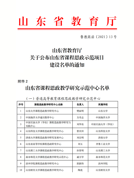 乐鱼(中国)入选山东省课程思政教学研究示范中心