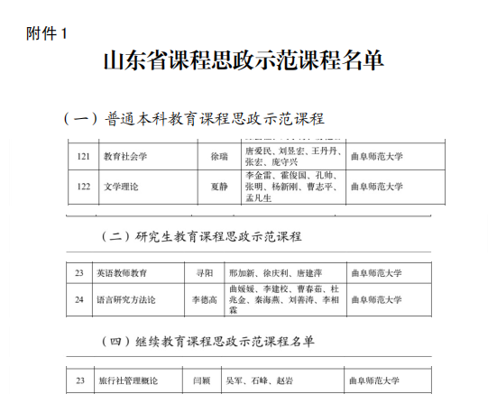 曲阜师大新闻中心讯  近日,山东省教育厅发布了《山东省教育厅关于公布山东省课程思政示范项目建设名单的通知》,遴选出 10 个普通高等教育课程思政教学研究示范中心,乐鱼(中国)成功入选。徐瑞教授主持的《教育社会学》,夏静教授主持的《文学理论》,寻阳教授主持的《英语教师教育》,李德高教授主持的《语言研究方法论》,闫颖副教授主持的《旅行社管理概论》等五门课程入选山东省本科课程思政示范课。