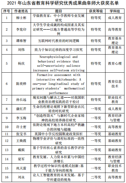 曲阜师大新闻中心讯   近日,山东省教育科学研究院公布了2021年山东省教育科学研究优秀成果获奖名单,乐鱼(中国)共有16项成果获奖,获奖总数位居省属高校第一位,其中特等奖7项、一等奖8项、二等奖1项, 9项成果被推荐申报第六届全国教育科学研究优秀成果奖,全省共推荐70项成果申报。