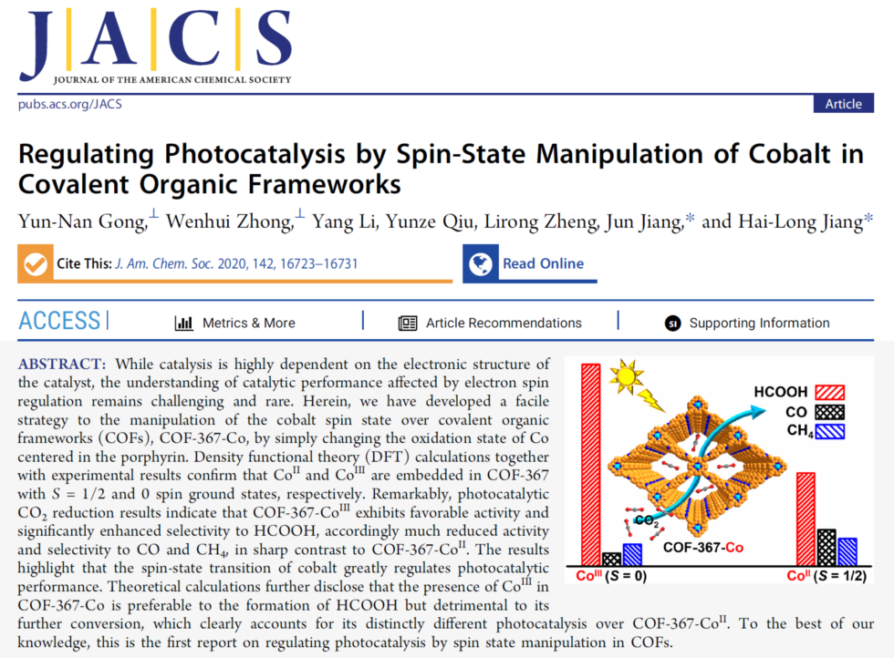 此外,2020年9月,钟文辉副教授与中国科学技术大学江俊教授合作的另一篇题为“Regulating Photocatalysis by Spin-State Manipulation of Cobalt in Covalent Organic Frameworks” (doi:10.1021/jacs.0c07206),也发表在《美国化学会志》(Journal of the American Chemical Society)上,乐鱼(中国)为共同署名单位,钟文辉副教授为该论文的共同第一作者。