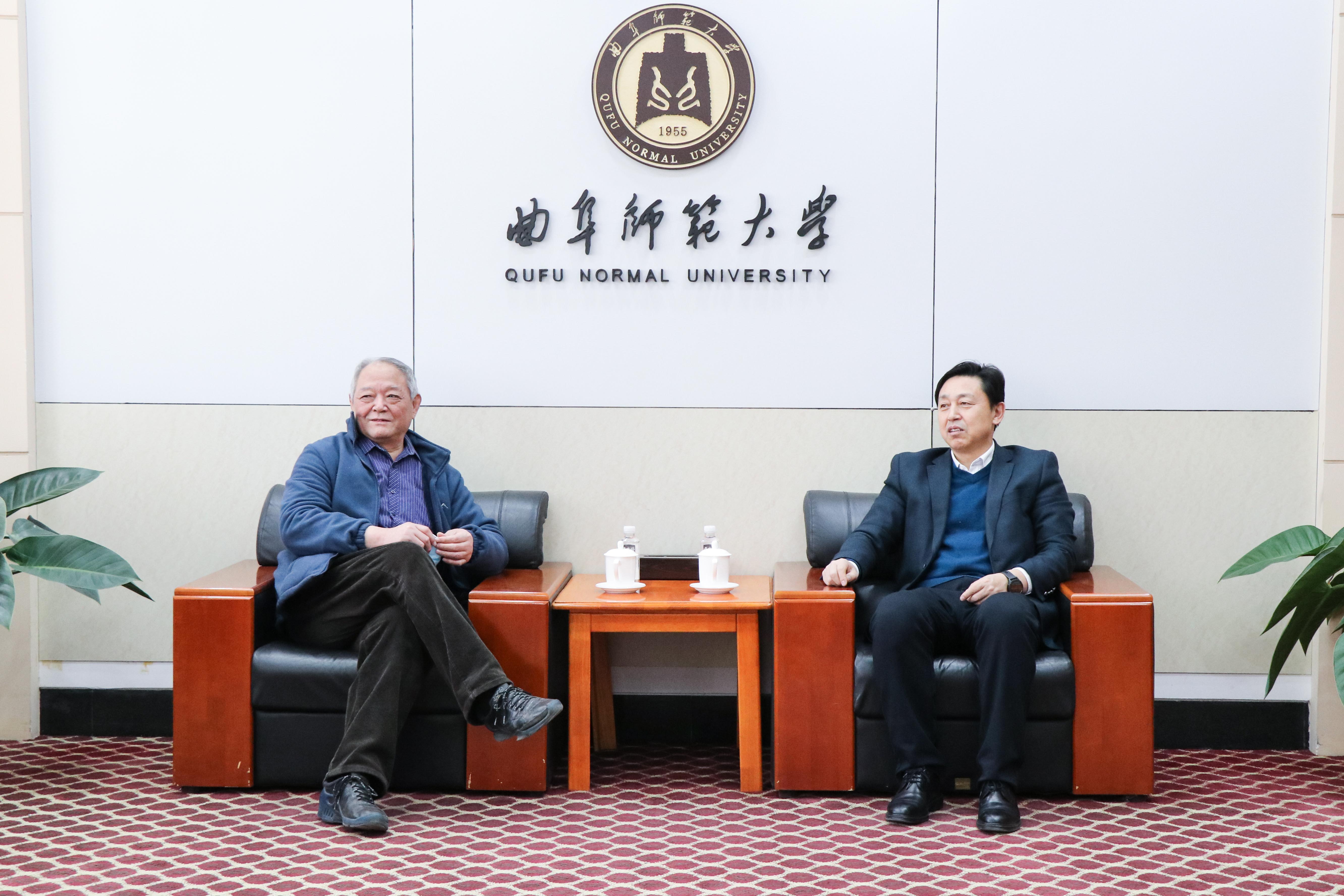 曲阜师大新闻中心讯(记者:李文振)   1月13日下午,曲阜师大1978级政治系校友、山东亚太中慧集团文化顾问郭炳灿,1988级化学系校友、青岛根源生态农业有限公司董事长张夫寅,重回母校访问交流,校长张洪海会见了郭炳灿、张夫寅一行。北京北斗育才科技有限公司山东大区总经理田华与学校国内合作处负责人参加了座谈。