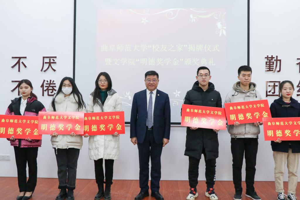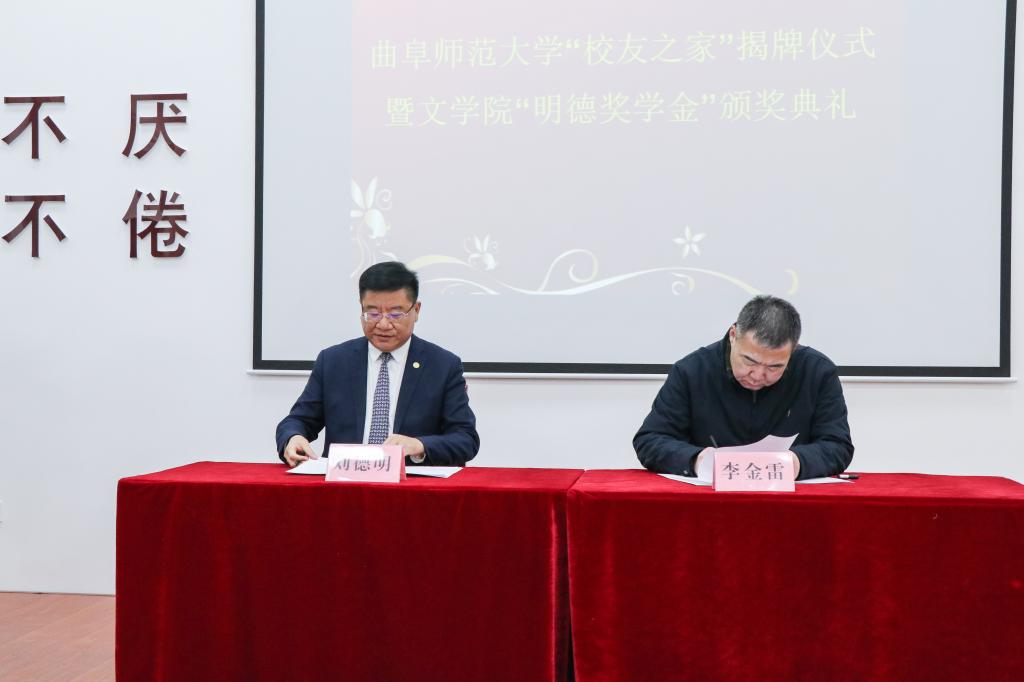 揭牌仪式结束后,“明德奖学金”颁奖典礼在“校友之家”举行。学校国内合作处处长孔宪福主持颁奖典礼。典礼上,刘德明与曲阜师大文学院党委书记李金雷签订了“明德奖学金”设立协议,刘德明校友现场为获奖学生代表颁发奖学金,获奖学生代表作了发言。