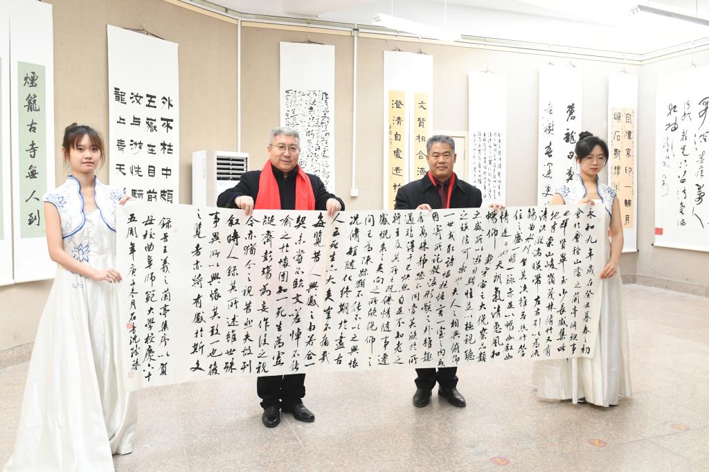开幕式上,娄以忠校友向学校捐赠墨宝《沁园春》和拓片、孟鸿声先生向学校捐赠书法类文献书籍500册、沈瑶琴校友向学校捐赠墨宝《兰亭序》,扈庆学代表学校接受捐赠,并为捐赠者颁发捐赠证书。李开元教授宣布“庆祝学校建校65周年--全国书法名家作品展”开幕。