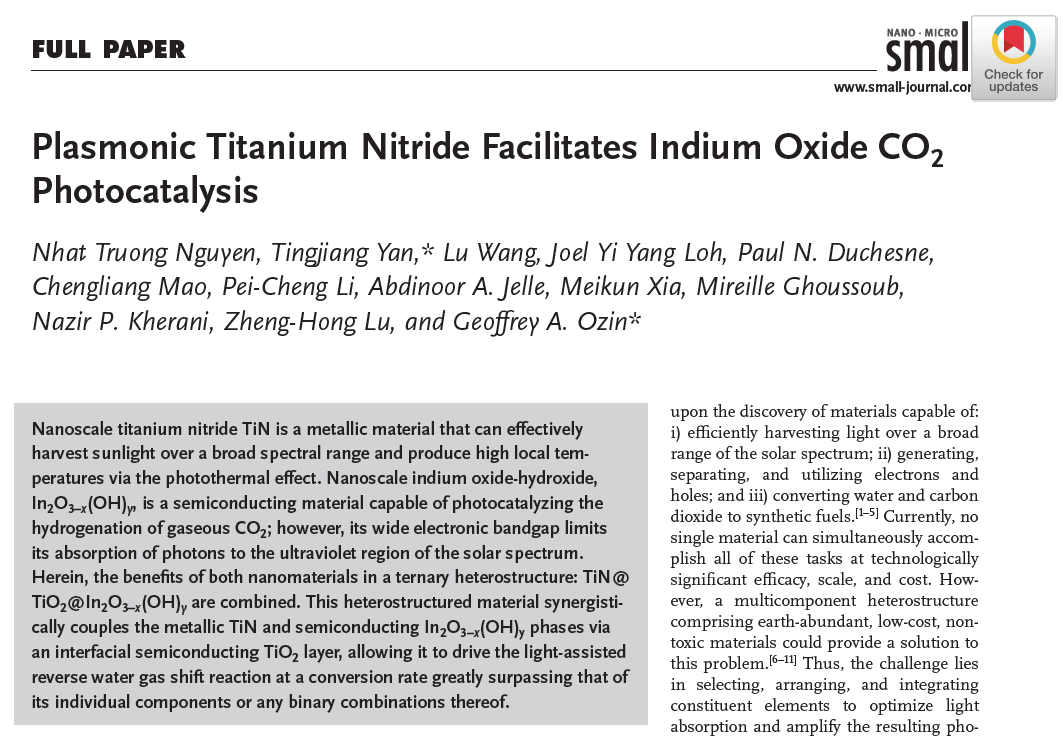 2020年11月,颜廷江教授与Ozin教授继续合作,将SFLPs型In2O3-x(OH)y与具有金属特性的TiN材料耦合,经过煅烧处理后,所得复合催化材料TiN@TiO2@In2O3−x(OH)y可以在较宽的光谱范围内收集阳光,并透过光热效应产生高的局部温度,使其能够以极大超过单个组分或任何二元组分的转化率驱动光激活水气变换反应。相关研究成果以“Plasmonic Titanium Nitride Facilitates Indium Oxide CO2 Photocatalysis”为题发表在国际著名刊物Small(影响因子11.459)。乐鱼(中国)为论文的通讯署名单位。
