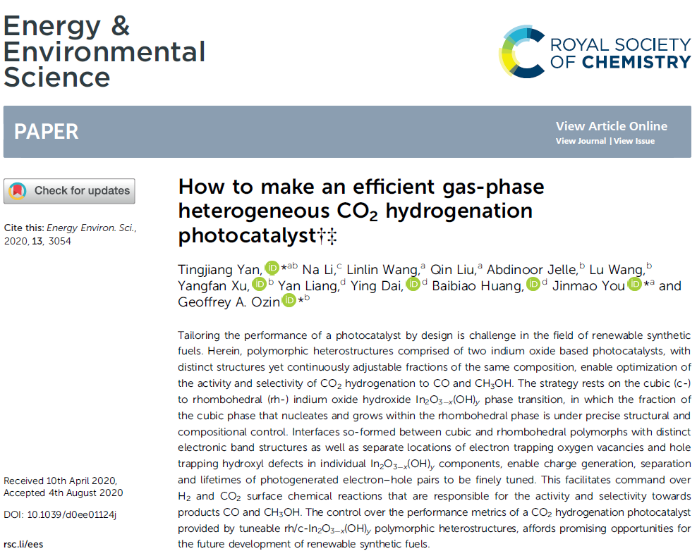 此外,2020年8月,颜廷江教授还基于立方相(cubic,c-)到菱形相(rhombohedral,rh-)氧化铟In2O3-x(OH)y的相变,通过调节rh/c-In2O3-x(OH)y多晶型异质结对CO2加氢光催化剂性能的指标,构建出了新型高效的缺陷异相结光催化剂,对未来可再生合成燃料的发展提供了良好的契机。相关工作发表以“How to Make an Efficient Gas-Phase Heterogeneous CO2 Hydrogenation Photocatalyst”为题发表在国际顶级期刊Energy & Environmental Science(影响因子30.289)。乐鱼(中国)为论文的第一署名单位和第一通讯署名单位。