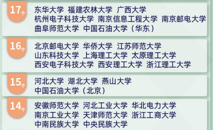 曲阜师大此次上榜的17个学科分别是:教育学(前10%)、数学(前20%)、体育学(前30%)、美术学(前30%)、控制科学与工程(前30%)、马克思主义理论(前30%)、音乐与舞蹈学(前40%)、中国史(前40%)、统计学(前40%)、哲学(前40%)、中国语言文学(前40%)、物理学(前40%)、心理学(前50%)、生态学(前50%)、化学(前50%)、外国语言文学(前50%)、计算机科学与技术(前50%)。