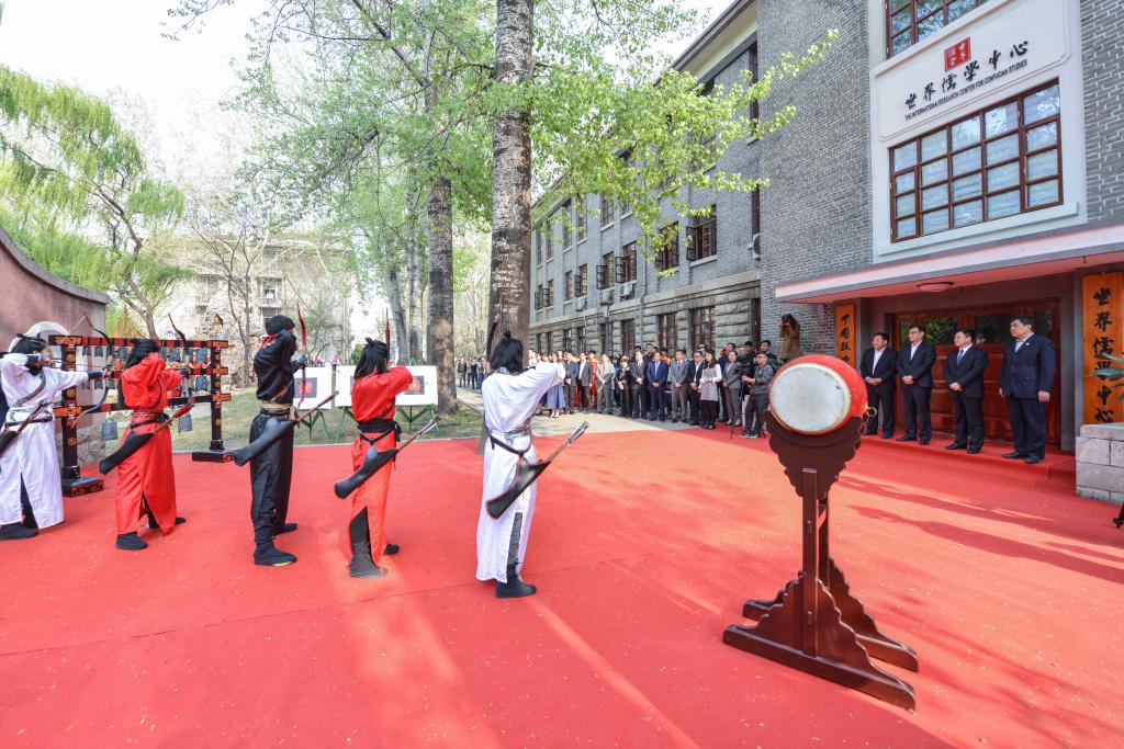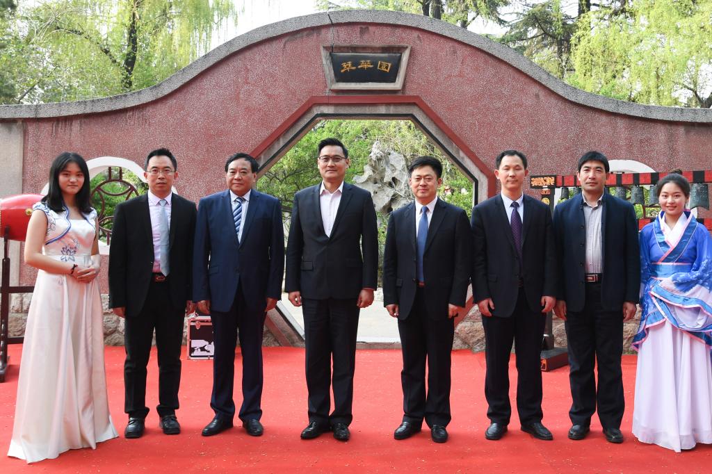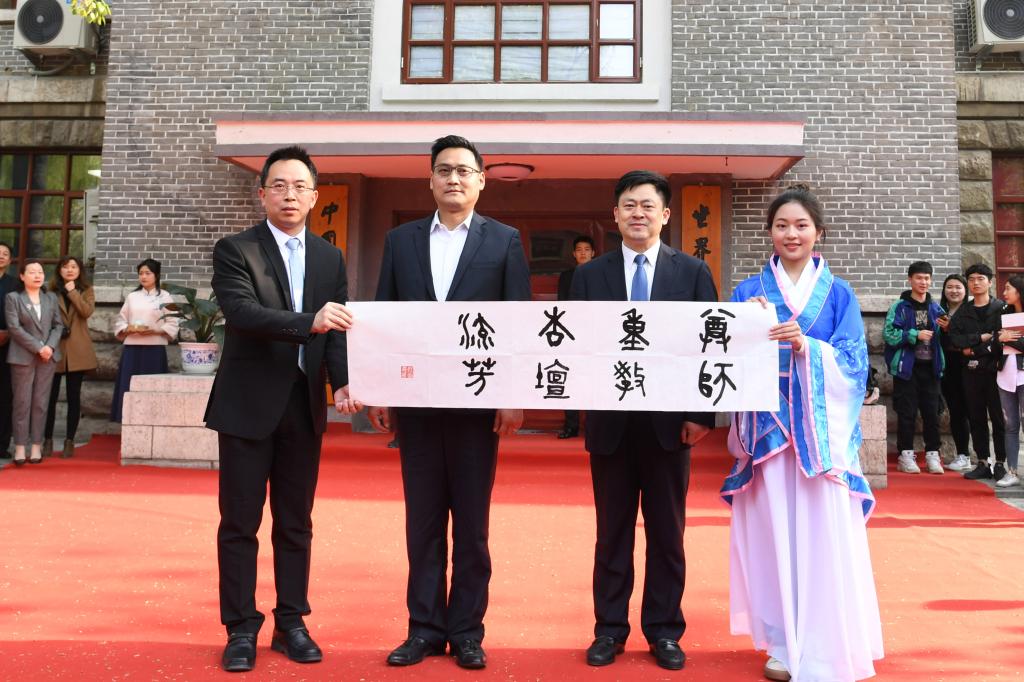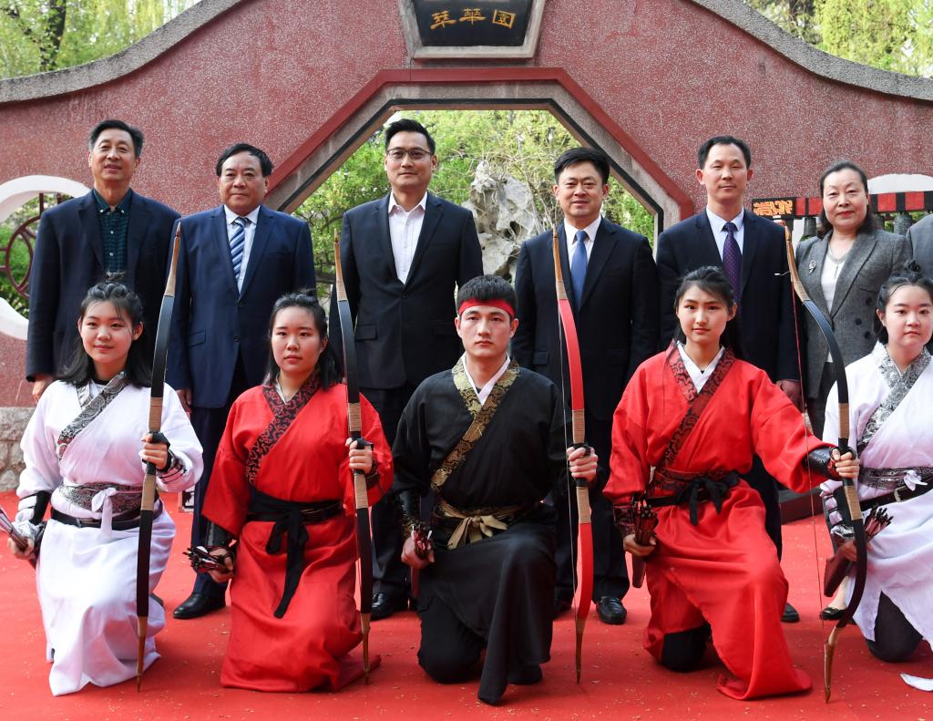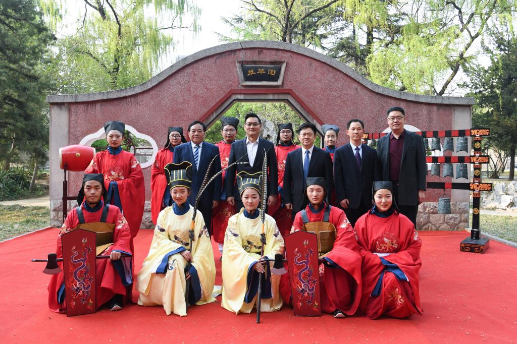 我校学子还现场为各位领导嘉宾献上了精彩的乐艺、射艺、书艺表演,展现了圣地学府青年学子的儒风雅韵。音乐学院的同学们随笙箫钟磬之律表演了《六小舞谱》中的“干舞”和“羽舞”,体育科学学院的同学们在阵型变换中展示了孔子射艺,书法学院同学挥毫展示了篆书书写,孔垂长先生特地钤印“尊师重教,杏坛流芳”并合影留念