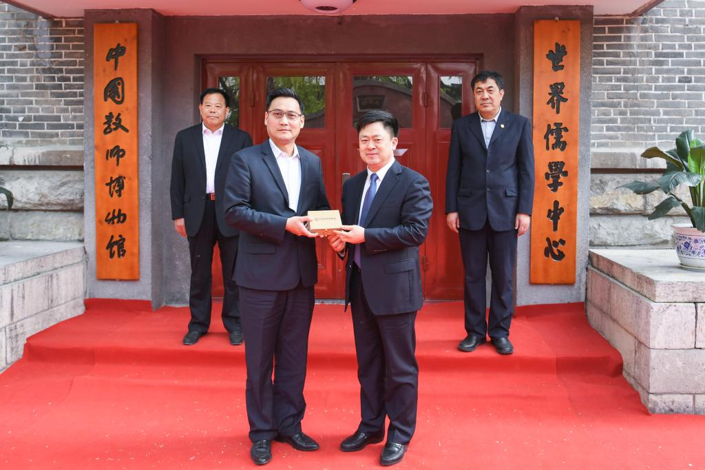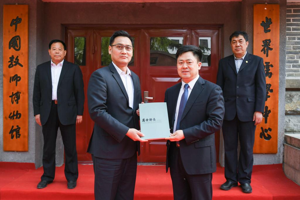 来到中国教师博物馆,戚万学向孔垂长先生赠送了教师博物馆特别定制的尼山石名章,孔垂长先生向博物馆赠送了《万世师表——书画中的孔子》一书。孔垂长、戚万学共同为中国教师博物馆青少年文化教育公益项目“杏坛学堂”揭牌。