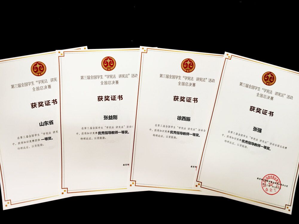 由我校法学院教师张益刚、张强、徐西振带队的山东省代表选手获得个人赛小学组冠军、初中组季军、高校组亚军;并在团体赛中斩获中小学组知识竞赛一等奖、高校组辩论赛二等奖;张益刚、张强、徐西振获得一等奖优秀指导教师奖,并受邀赴京参加主题为“深入学习贯彻实施宪法 坚定不移推进改革开放”的国家宪法日座谈会,现场聆听全国人大常委会及国家各部委推进全面依法治国的指示精神。