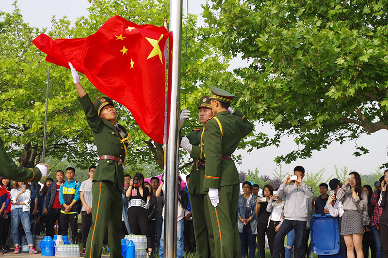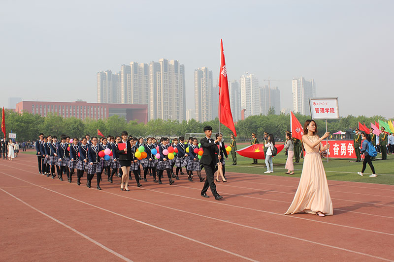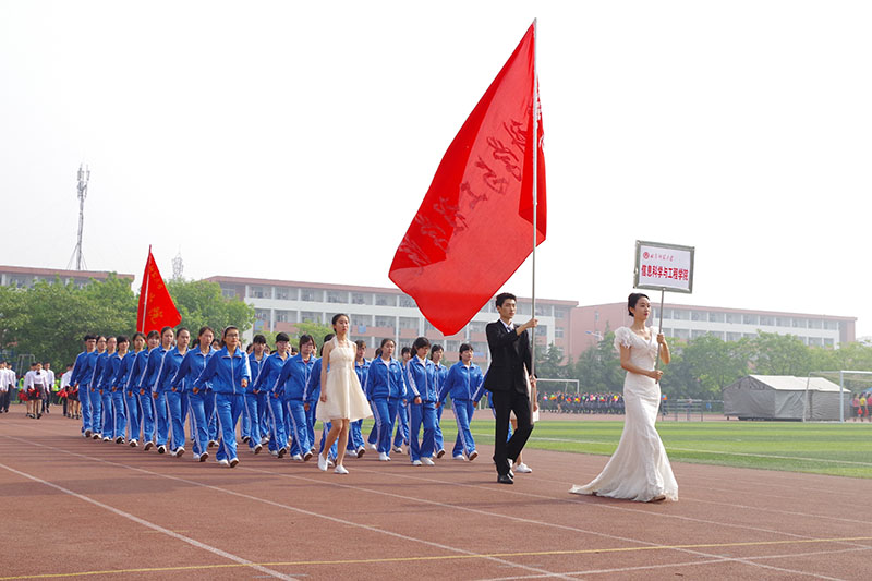 各学院方队入场后,升旗仪式开始。伴随着雄浑的国歌,五星红旗在师生的注目礼下徐徐升起。荆兆勋致开幕词,首先他对本次运动会的召开表示热烈祝贺,并向大会组委会及全体运动员、裁判员致以衷心的感谢。他指出,体育工作是学校教育事业的重要组成部分,是大学生健康成长、全面发展的保障。今年是我校十三五规划的开局之年,正是深入改革争创一流的关键时期。我校积极改建体育设施,丰富体育活动形式,课内与课外相结合,争取不断完善体育工作体系。他指出,各院学子接受检阅的同时,也是对他们良好精神风貌的展示,希望广大师生以此次运动会为契机,追求更高、更快、更强的目标,形成“崇尚运动,热爱体育,关注健康,全员参与”的良好氛围,提高健康意识,加上体育锻炼,为学校发展新目标做出积极贡献。随后,裁判员代表和运动员代表庄严宣誓,严守竞赛规则,维护体育道德,确保比赛的公平公正。