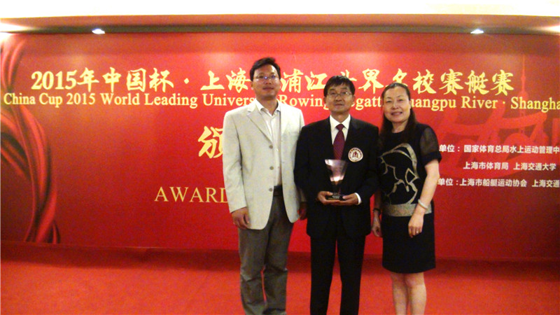 7月14日—17日,2015中国杯·上海黄浦江世界名校赛艇赛在上海交通大学举行,我校代表队取得B组八人单桨有舵手2000米比赛第一名,划船器比赛(26所高校)第一名的好成绩,学校副校长王继锁、体育科学学院院长曹莉参加了颁奖晚会,王继锁副校长并为获奖单位颁奖。