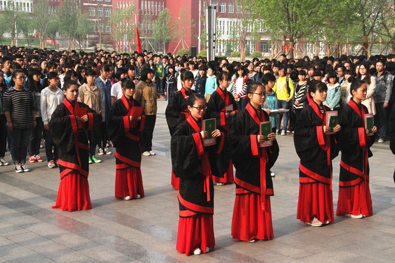 在庄严的升国旗仪式中四千余名青年团员和团干部重温入团誓词,发出铮铮青春誓言。8名18岁学生着汉服肃立,共同迎来了属于自己的“成人礼”与会领导为其插簪,并赠予成人纪念证章。