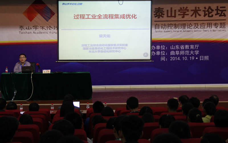 10月19日上午,“泰山学术论坛¾自动控制理论及应用专题”学术会议于我校开幕。中国工程院院士、国家自然科学基金委信息学部主任、东北大学教授柴天佑,中国工程院院士、中南大学教授桂卫华,我校党委副书记孙文亮,副校长马东骅出席开幕式并在主席台就座。开幕式由马东骅主持。