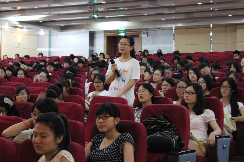 聘任仪式结束后,王立非教授做了题为“商务英语专业的能力、知识和素质要求:解读国家标准”的学术报告会。报告会分为“商务英语专业发展现状”、“标准要求”、“建设思路”三个方面的内容。王教授从上海自贸区的建立与发展谈起,提出我国已拉开第三次产业结构调整的序幕,这必将为商务外语人才的需求打开一个广阔的市场。针对商务英语与普通英语的差别,王教授指出商务英语专业本科阶段所应具有的“三个五”,即五种素质要求(思想素质、文化素质、专业素质、职业素质、身心素质)、五种能力(语言运用能力、跨文化交际能力、思辨与创新能力、商务实践能力、自主学习能力)和五种知识(语言知识、商务知识、跨文化知识、人文社科知识、跨学科知识)。在深入分析了商务英语专业的内涵与建设要求后,王教授对翻译学院商务英语专业的建设思路提出了富有建设性的建议。报告结束后,王教授与同学们进行了热烈的互动交流,耐心回答了同学们关心的就业与专业发展等各方面问题。