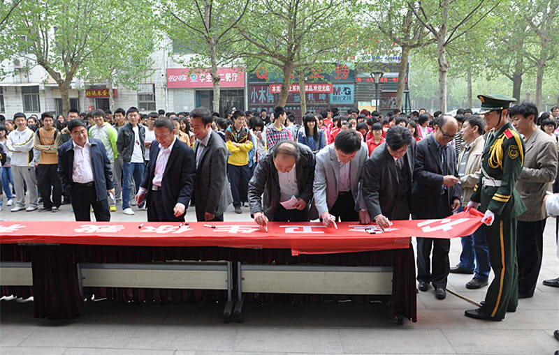 仪式上,领导、老师和同学们纷纷到警示标语上题字、签名,显示出对宿舍“安全卫生活动月”的大力支持和积极参与。