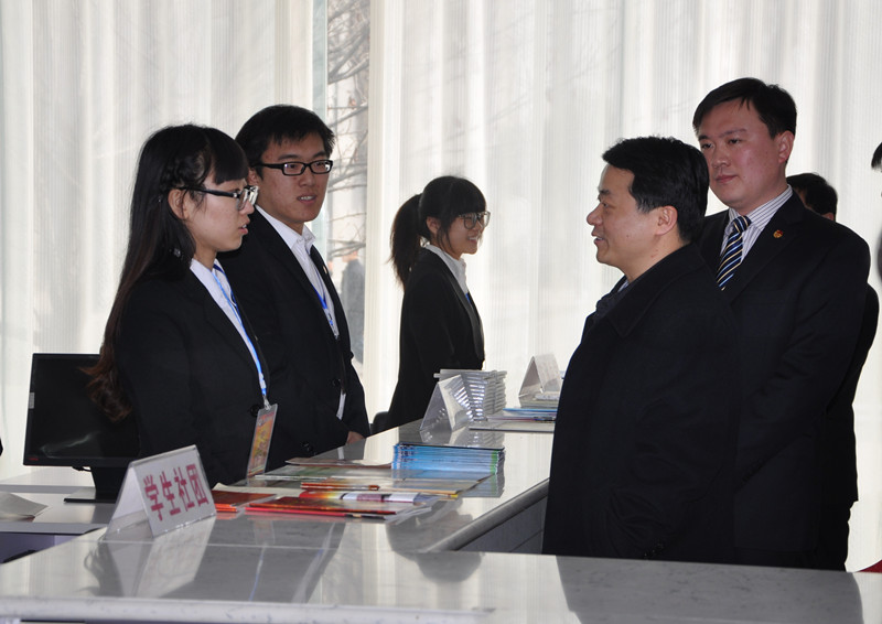 随后,在学生事务发展中心,傅振邦听取了校团委负责人关于我校基层团组织建设情况的汇报,与学生会的同学们亲切交谈,了解我校近年来在校园文化活动、科技创新、社会实践、志愿服务、大学生创业就业、学生社团等方面的发展情况。他对我校的共青团工作给予了充分肯定,他说,学校党委高度重视和支持青年工作,共青团工作基础扎实,活动丰富,特色鲜明。团员青年们青春有朝气,展现出了良好的精神风貌。他鼓励我校团学组织要继续凝聚好青年、服务好青年、引领好青年,为广大学子多创造价值,为服务学校中心工作再立新功。