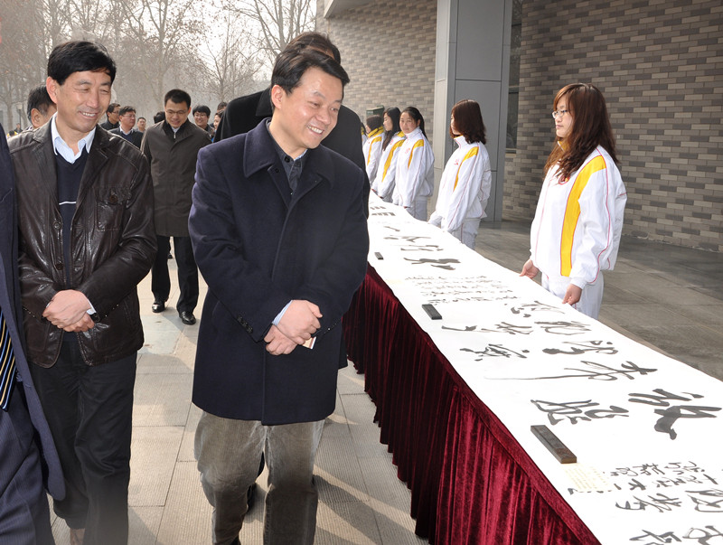 我校作为傅振邦此次到山东调研的唯一一所省属高校,主要展示开展优秀传统文化教育活动方面取得的成绩。傅振邦一行首先观看了经典诵读和论语书写展示活动。500名学子齐声诵读古文典籍名句,吟诵古典诗词。书法社团现场书写论语,并展示了“师生共筑中国梦”百米长卷现书活动成果。