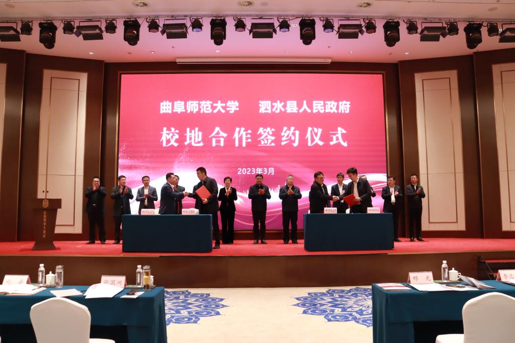 曲阜师大乐鱼官方网页版讯 3月23日下午,曲阜师大与泗水县政府签订校地战略合作协议,学校党委书记邢光、党委副书记李志红、党委常委、副校长纪洪涛,济宁市委常委、政法委书记张国洲、泗水县委书记赵鑫、县人大常委会主任梁基武、县政协主席程广利等出席签约仪式。