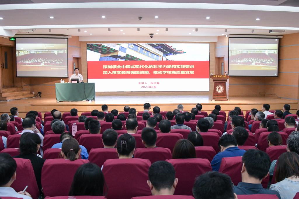 6月13日上午,读书班举行专题辅导报告会。党委副书记、校长张洪海作了“深刻领会中国式现代化的科学内涵和实践要求,深入落实教育强国战略,推动学校高质量发展”专题辅导报告,深入系统阐释了中国式现代化的历史逻辑、中国特色、本质要求、重大原则和战略安排,并从培养担当民族复兴大任的时代新人、加快建设高质量教育体系、全面提升教育服务高质量发展的能力、在深化改革创新中激发教育发展活力、增强我国教育的国际影响力、培养高素质教师队伍等六个方面,回答了“教育强国、曲师何为”的问题。