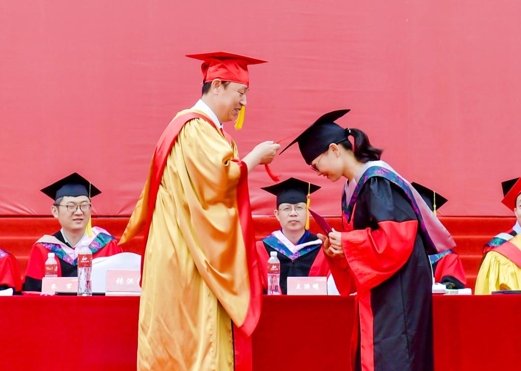 典礼上,学校党委书记邢光,党委副书记、校长张洪海,分别为获得博士学位的同学逐一拨穗正冠、颁发学位证书。在主席台就坐的学校领导和老师共同为全体获得硕士和学士学位的同学授予学位。