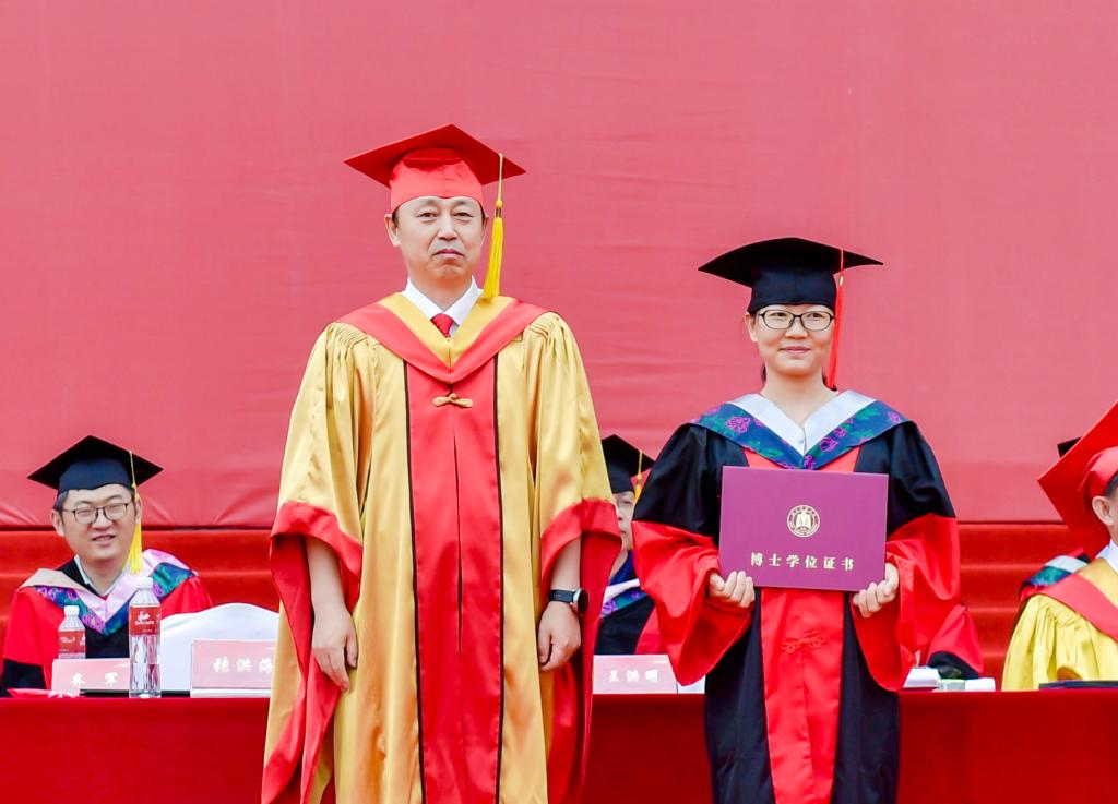 党委副书记、校长张洪海为获得博士学位的同学拨穗正冠、颁发学位证书