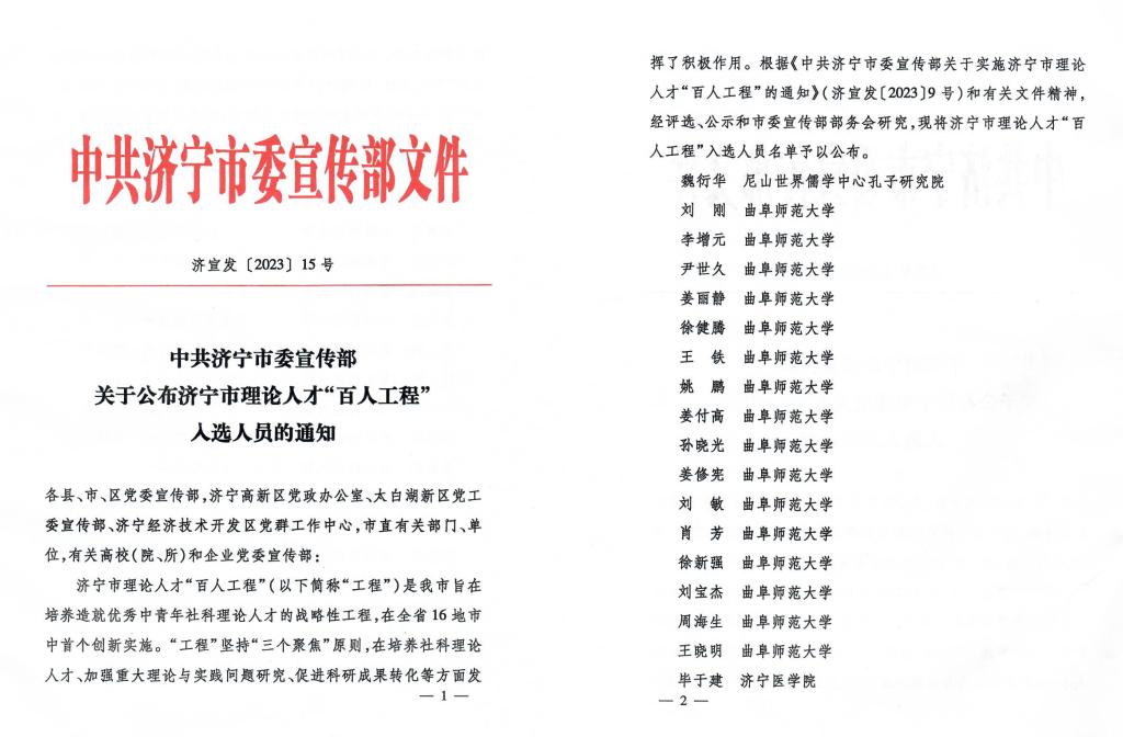 曲阜师大乐鱼官方网页版讯 近日,济宁市委宣传部印发了《关于公布济宁市理论人才“百人工程”入选人员的通知》,曲阜师大刘刚、李增元、尹世久等5位省级理论人才“百人工程”成员和姜付高、刘敏、肖芳等11名专家学者入选,入选人员数量位居济宁市各单位首位。