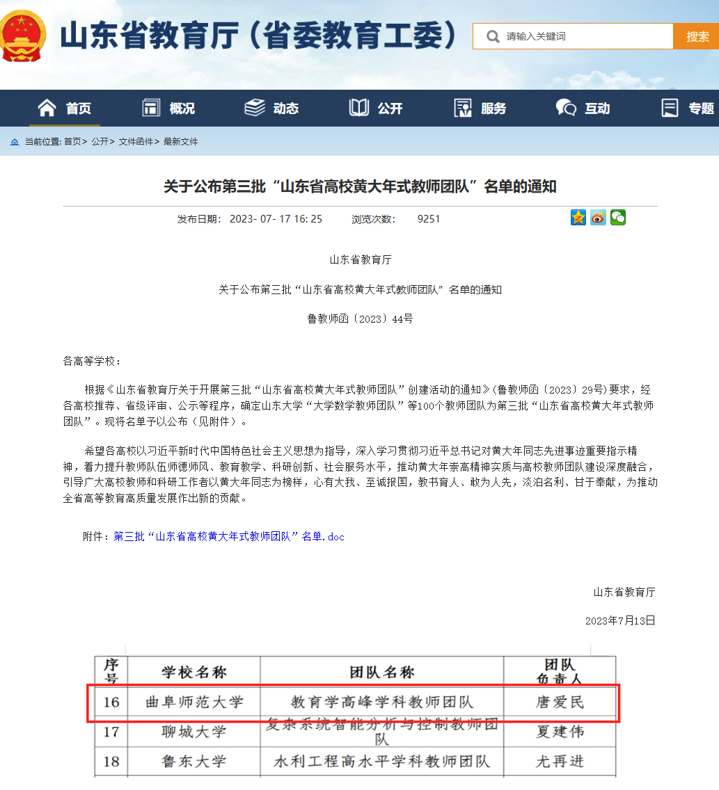曲阜师大教育学院讯 近日,第三批“山东省高校黄大年式教师团队”名单公布,由唐爱民教授领衔的乐鱼(中国)教育学高峰学科教师团队成功入选。