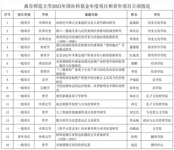 曲阜师大本年度立项项目涉及哲学、理论经济、法学、中国历史、世界历史、宗教学、中国文学、体育学、管理学、外国文学等10个学科,分布于10个单位,其中历史文化学院3项,法学院、经济学院、孔子文化研究院、体育科学学院各2项,翻译学院、马克思主义学院、期刊中心、文学院、政治与公共管理学院各1项。
