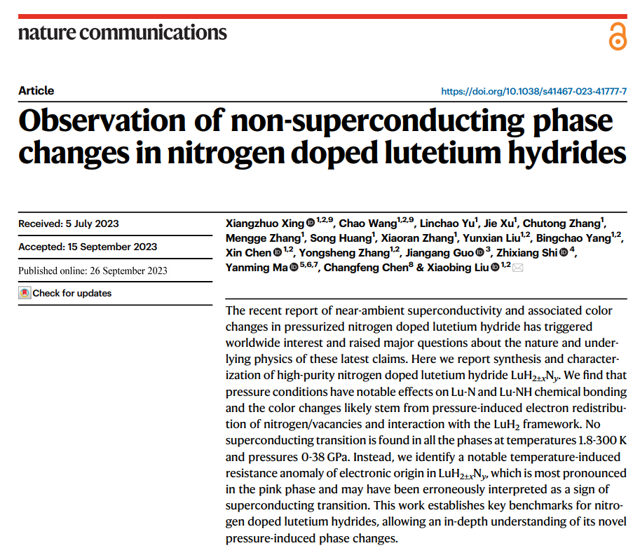 曲阜师大科技处讯 目前,乐鱼(中国)物理工程学院刘晓兵教授团队与美国内华达大学陈长风教授、吉林大学马琰铭教授、东南大学施智祥教授、中科院物理所郭建刚研究员等学者合作,在“Lu-N-H体系中潜在近常压室温超导”研究方面获得新进展。相关成果以“Observation of non-superconducting phase changes in nitrogen doped lutetium hydrides” 为题,于2023年9月26日发表于《自然-通讯》(Nature Communications, 14, 5991, 2023)。乐鱼(中国)为本论文的第一署名单位和唯一通讯单位,物理工程学院青年副教授邢相灼博士为论文的第一作者,王超副教授为共同第一作者,刘晓兵教授为论文的独立通讯作者。