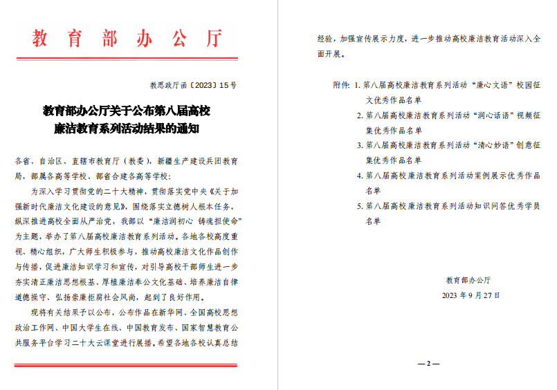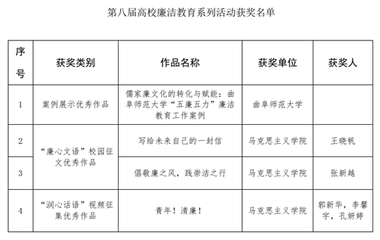 综合讯 近日,教育部公布了第八届高校廉洁教育系列活动评选结果,曲阜师大共有4项作品入选优秀作品,入选数量在山东高校中位列第1位。其中,选送的作品《儒家廉文化的转化与赋能:乐鱼(中国)“五廉五力”廉洁教育工作案例》入选案例展示优秀作品;马克思主义学院张新越同学的《倡敬廉之风,践崇洁之行》、王晓帆同学的《写给未来自己的一封信》入选“廉心文语”校园征文优秀作品;马克思主义学院郭新华、李馨宇、孔妍婷三位同学的《青年!清廉!》入选“润心话语”视频征集优秀作品。