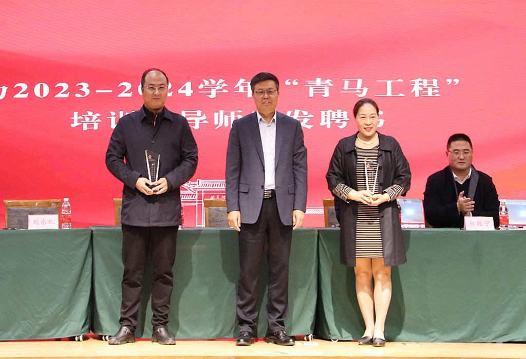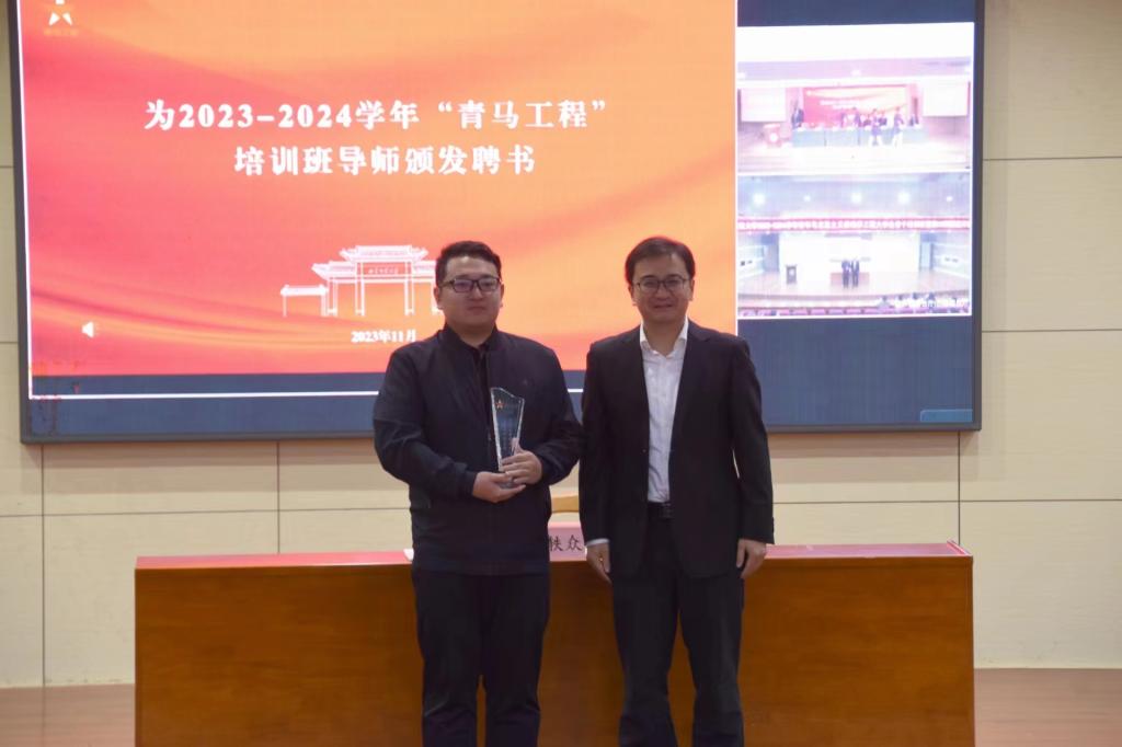 仪式上,在主席台就座的领导为青马工程培训班导师王曰美、刘永礼、刘扬帆颁发聘书,为2022—2023学年“青马工程”培训班学员代表颁发结业证书。