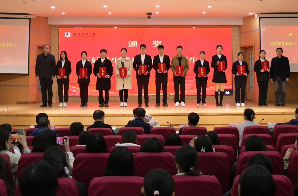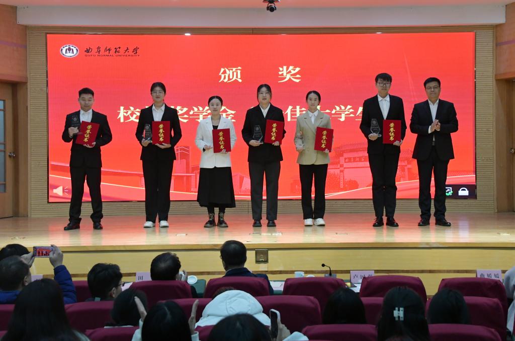 第二阶段举行了颁奖典礼。张洪海与曲阜校区获得校长奖学金的学生合影;卢国强和姜美颖分别在两校区为10名校长奖学金获得者颁发了奖杯和“十佳大学生”证书;各学院党委副书记为两校区共100名学生颁发了“百优大学生”证书。
