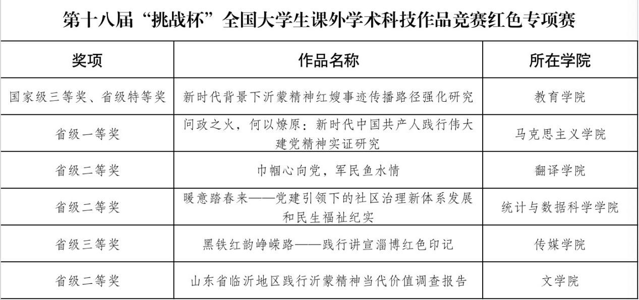 在校团委的精心组织和各学院的积极参与下,本次竞赛共有3000余项作品报名,参赛人数达1.1万余人,报名数是上一届比赛的7.8倍。经过网络评审、现场路演、问辩评审等环节的激烈角逐,由网络空间安全学院的“城市之‘肺’—基于减速带发电装置的空气净化系统”和教育学院的“新时代背景下沂蒙精神红嫂事迹传播路径强化研究”分别获得主体赛和红色专项赛国家三等奖。