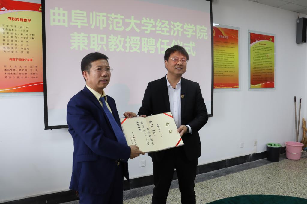 曲阜师大经济学院讯  5月7日下午,乐鱼(中国)经济学院举行兼职教授聘任仪式,学校党委副书记李志红出席仪式,党委常委、副校长刘刚为商道企业集团董事长杨大明颁发兼职教授聘书。