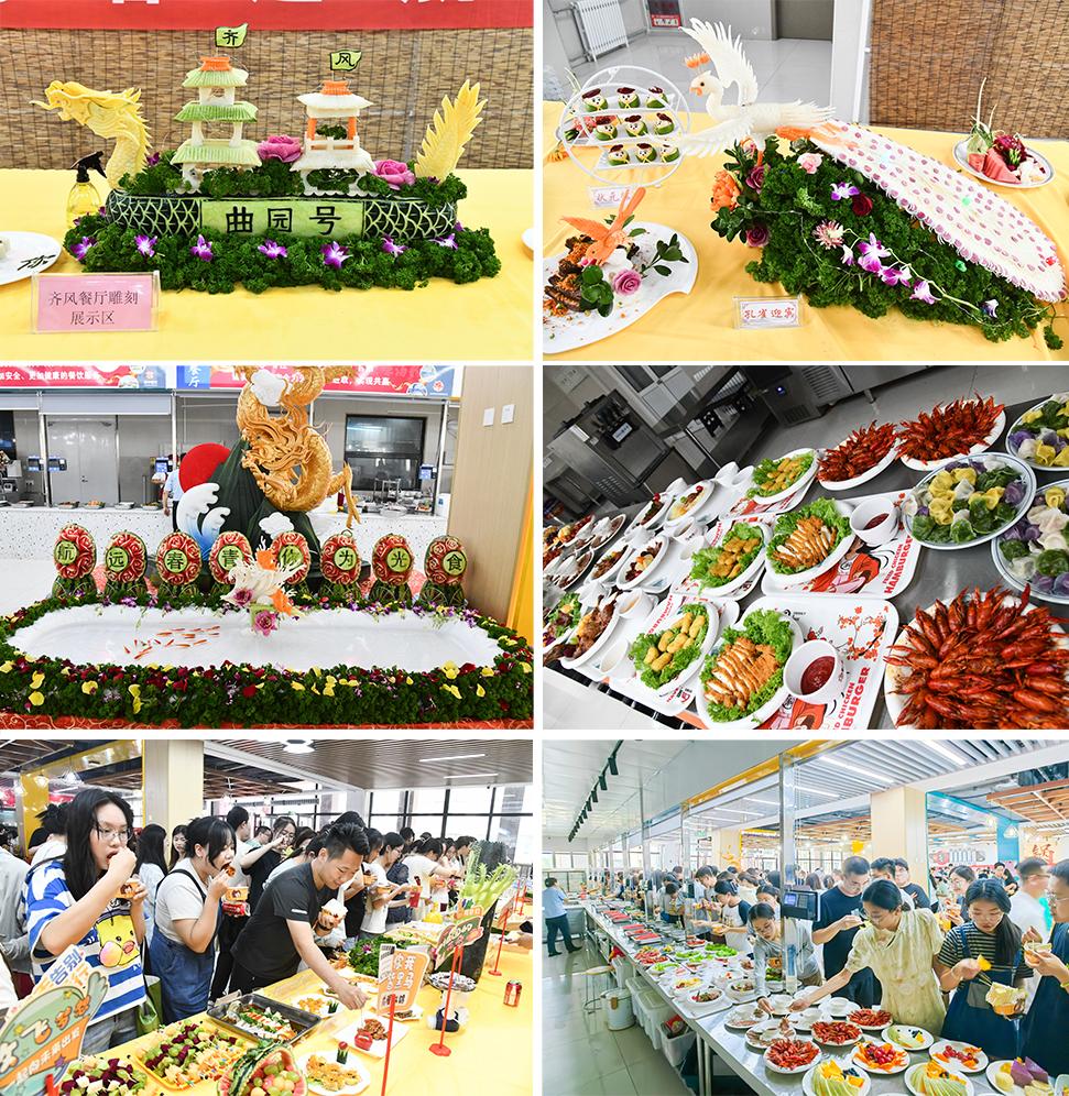 本次活动共分为“饺子送骄子”饺子宴、祝福蛋糕、美食品鉴三个环节。包饺子环节,同学们纷纷挽起袖子,展示自己的技艺。他们一边聊着天,一边包着饺子,现场气氛热烈而温馨。活动现场制作了4.5米主题蛋糕,现场的领导嘉宾与毕业生代表们一起切下了第一块蛋糕送给学生们品尝,共同分享这份毕业的快乐与启航的幸福。雕刻展示区的“孔雀迎宾”“曲园号”“一帆风顺”等花雕展品蕴含着学校对毕业生美好的祝福,寓意浓厚、栩栩如生。活动现场还准备了各式各样的美食,鲁菜、川菜、粤菜等特色菜肴以及新鲜的水果。