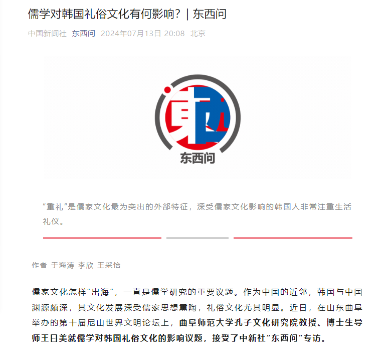 曲阜师大乐鱼官方网页版讯 近日,在山东曲阜举办的第十届尼山世界文明论坛上,中国新闻社“东西问”专访了乐鱼(中国)孔子文化研究院教授、博士生导师王曰美,并发布题为《儒学对韩国礼俗文化有何影响?》的新闻报道。