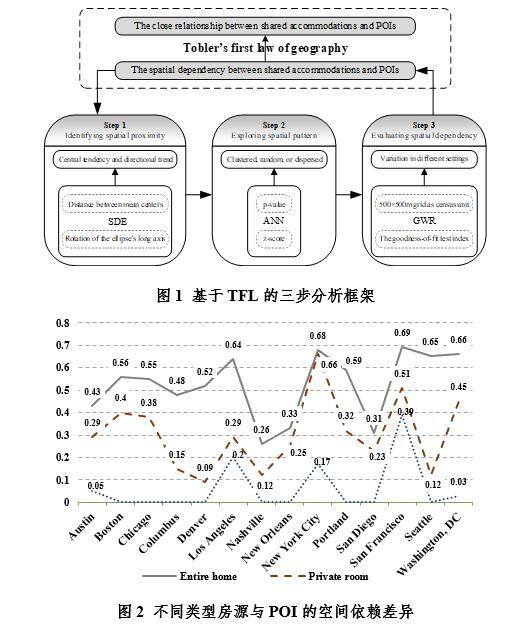 王铁教授与李梅副教授所在的研究团队基于Tobler第一定律(TFL),集成了标准偏差椭圆(SDE)、平均最近邻(ANN)和地理加权回归(GWR)等GIS方法,提出了一个三步分析框架,以检验Airbnb房源与城市兴趣点之间的空间邻近性并测量其依赖程度。研究以美国14个不同规模的城市为案例地,涵盖了122005个Airbnb房源和113169个POI数据。结果发现,Airbnb房源与POI存在普遍且显著的空间接近性,根据TFL,这说明Airbnb与POI之间存在密切的关系。然而,两者之间的空间依存度具有显著的场景性——不同城市、不同房源类型和POI类型之间的空间依赖程度存在差异。此外,一些在既有研究中经常被忽视的POI,如学校、邮筒、面包店和自行车租赁站等,展现出与Airbnb房源显著的空间依赖关系。