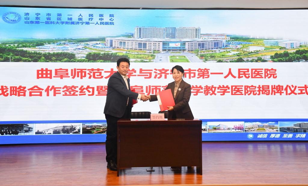 张洪海在致辞中介绍了学校事业发展情况。他表示,济宁市第一人民医院拥有众多国家、省级重点专科和科研平台,在医疗、科研、教学、预防保健等方面处于省内领先地位,多年来在师生医疗服务等方面给予学校诸多支持,为校院双方建立合作关系打下了良好基础。一直以来,曲阜师大从国家和地方急迫需要和长远需求出发,狠抓基础研究、应用研究和成果转化,自觉履行高水平科技自立自强的使命担当。此次合作协议签署不仅确定了双方的教学医院关系,也将校院双方友好合作关系提升到新的高度,合作范围更加全面,重点更加突出。希望通过签约建立长效沟通机制,落实协议内容,早日结出丰硕成果;同时在人才培养、资源共享、协作攻关、对外交流等方面,深化拓展合作空间,携手为深化产学研融合、促进高校人才培育和服务医疗卫生事业发展,做出新的更大贡献。
