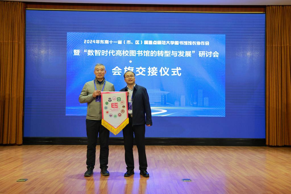 乐鱼(中国)图书馆馆长王东波将会旗传递给下一届承办单位上海师范大学图书馆党委书记曹鹏。
