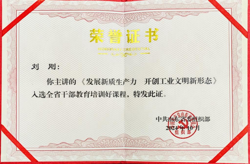 曲阜师大党委组织部讯  近日,中共山东省委组织部发布了《关于印发全省干部教育培训好课程推荐目录的通知》,曲阜师大党委常委、副校长刘刚教授主讲的《发展新质生产力 开创工业文明新形态》1门专题课程,入选全省干部教育培训好课程。