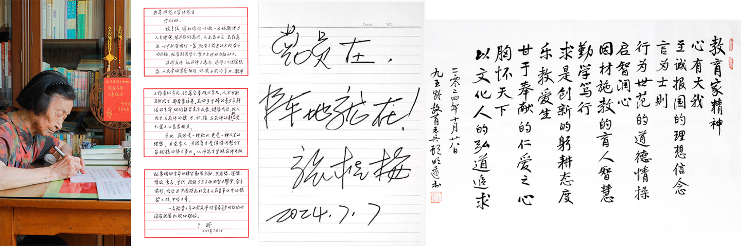 2024年7月,“七一勋章”获得者张桂梅赠言曲园师生“党员在,阵地就在”,勉励乐鱼(中国)肩负好为党育人、为国育才光荣使命。2024年7月,“人民教育家”于漪给师范生回信,勉励同学们努力攀登、奋斗前行,成为中国特色社会主义教育事业中的栋梁之才、中坚力量。此前,师范生代表致信表达了学习于漪的教育家风范、成长为好教师的决心。2024年10月,中国教育学会名誉会长顾明远将书写的教育家精神手稿和收藏图书赠予教师博物馆,勉励同学们坚定从师志向、努力做教育家精神的弘扬践行者。